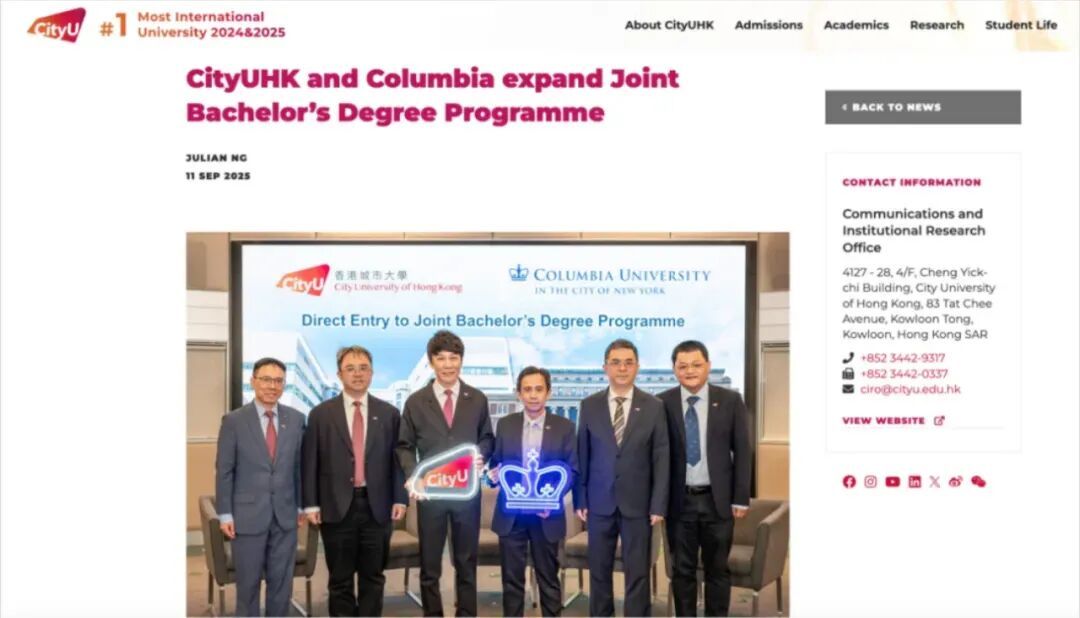 香港城市大学与美国哥伦比亚大学自2026/27学年起,将联合推出双联学士学位直接录取计划,面向全球高中毕业生开放申请。这一项目堪称本次申请季的最大亮点!