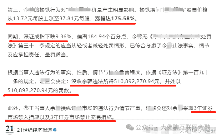 最后监管介入,没收违法获利,另外还处同等金额的罚款,最终余某被合计罚没10.23亿元,并处3年市场禁入措施。