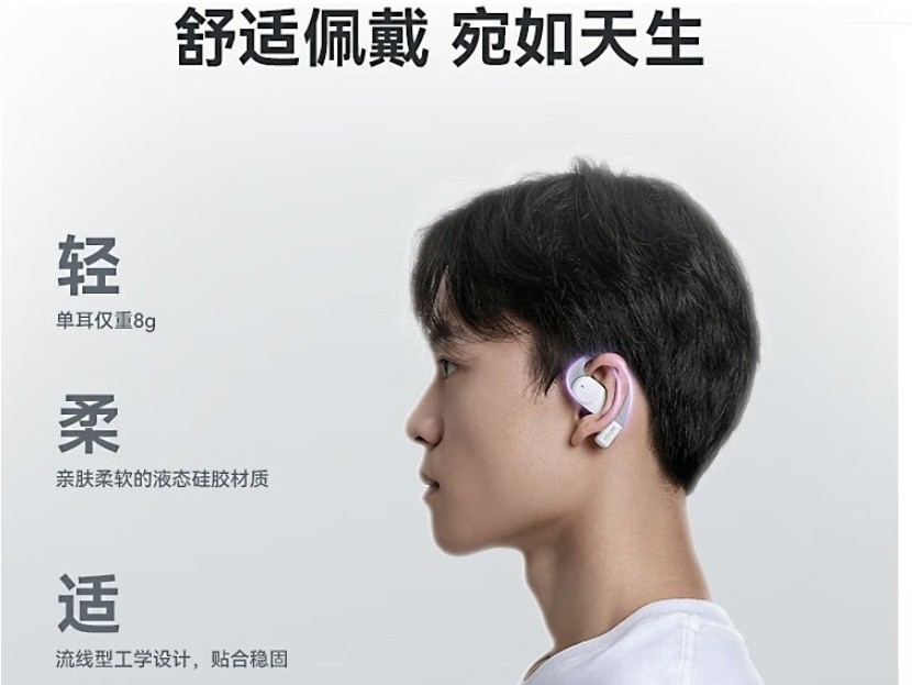 佩戴上这款耳机是真的挺舒服,这款耳机采用创新的 140° 三角稳固力学设计,并搭配C 形桥结构,即便处于运动状态,也能稳稳贴合耳部,不易脱落;而且单耳仅重8.9 克,佩戴起来十分轻松舒适,长时间使用也不会有压迫感,能让耳朵始终保持轻松舒适的状态。