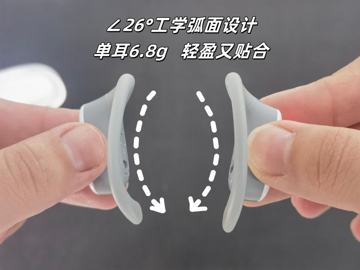 佩戴感也很好,单耳才 6.8g,轻得跟没戴似的,就算戴一下午处理工作,耳朵也不觉得压得慌;它那个26° 的工学弧面设计也特贴心,刚好能贴住耳廓,戴上去又稳又舒服,不会老往下掉;硅胶材质还软乎乎的,摸着手感特好,不管是上班戴、通勤戴,还是运动的时候戴,都合适。