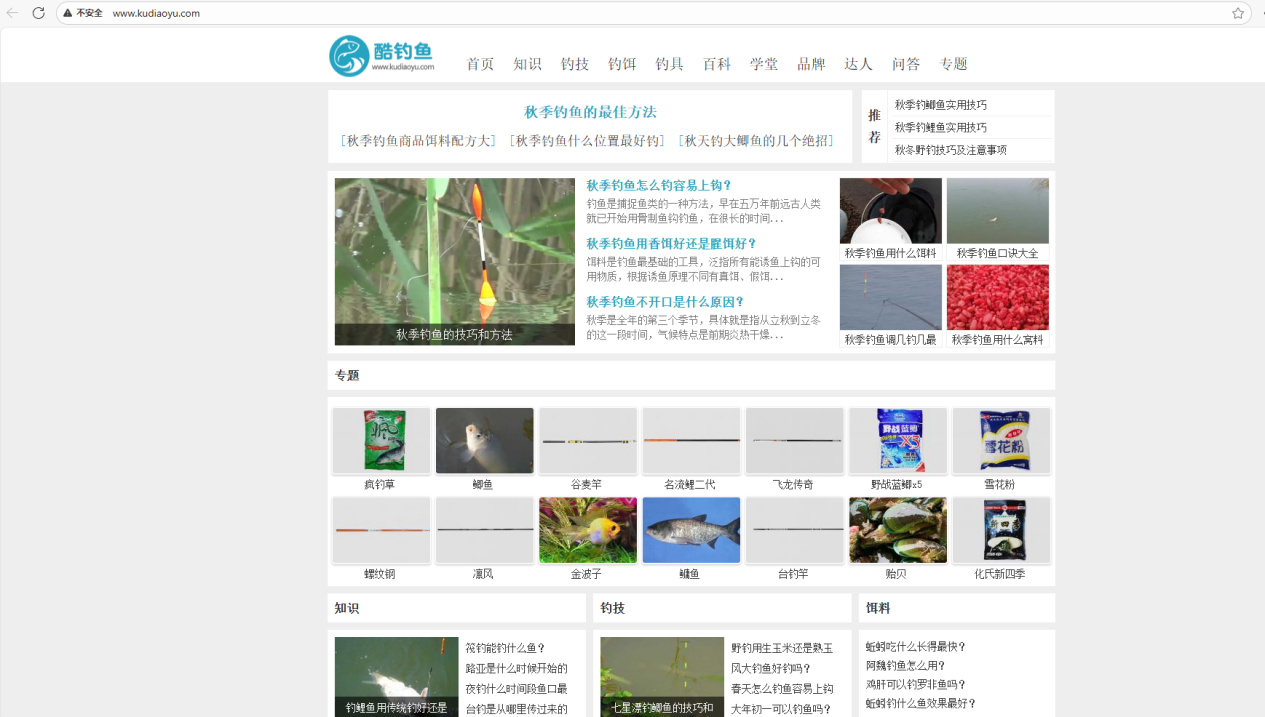 2、酷钓鱼一个专注于钓鱼技巧的网站。想要了解秋天钓鱼的哪个位置更好,怎么搭配饵料翘嘴什么时候钓最好?网站做了详细的分类,包括钓鱼的知识,钓饵的选择、钓具的使用、鱼类的百科等等,方便你找到想要的内容