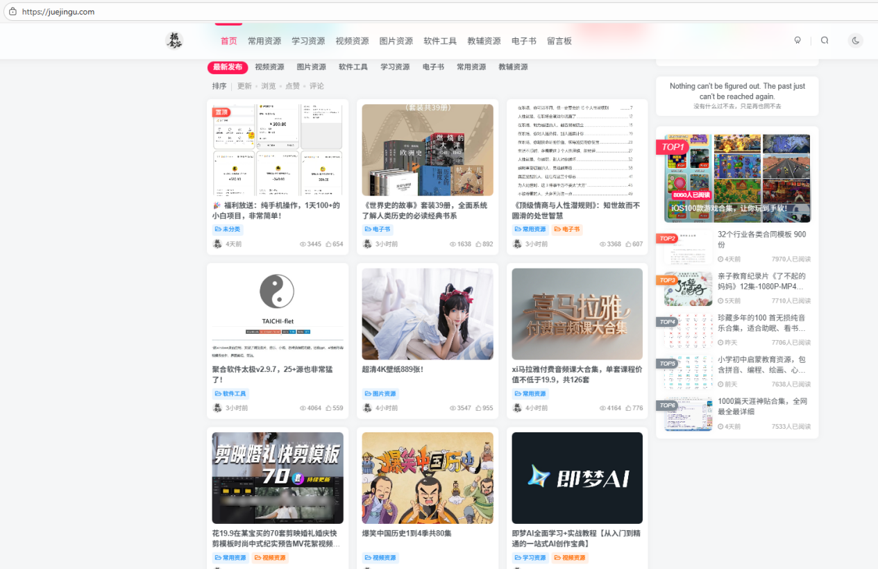 14、掘金谷这个网站,简直是“万能小卖部”,啥都有:影视、壁纸、自媒体软件工具、小吃配方、中小学幼教资料、考公考编课程,甚至还有车载U盘和短剧素材……市面上的资料基本都有,需要什么资料还可以留言,站长会及时更新,重点是,全都能白嫖。