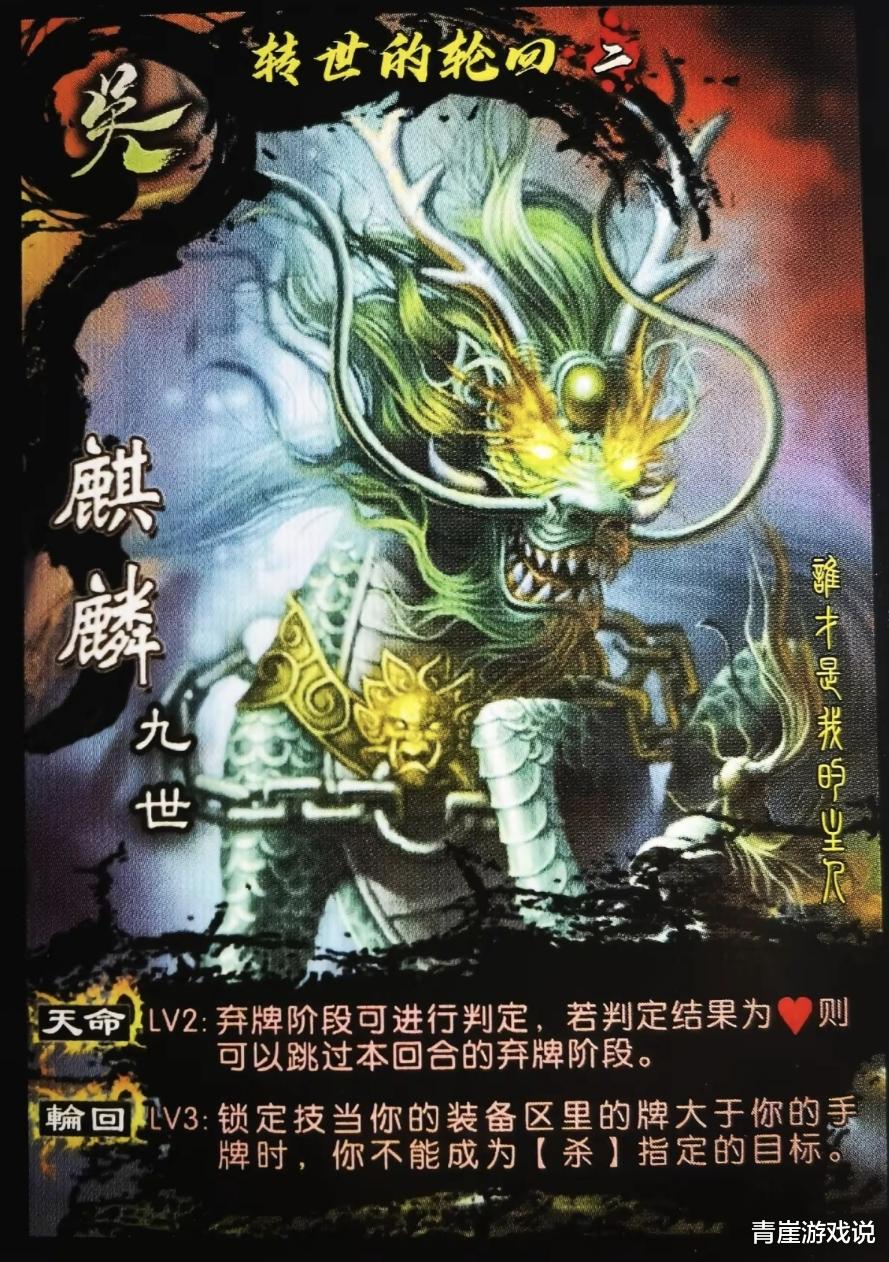 最后一位神兽是麒麟,称号是转世的轮回。【天命】是弃牌阶段可进行判定,概率跳过弃牌阶段,【轮回】是装备区的牌多于手牌,则免疫杀。总体来说麒麟偏向防御,【天命】算半个【克己】,【轮回】则是半个【父荫】,缝缝补补下来还是远远不如诸葛瞻……