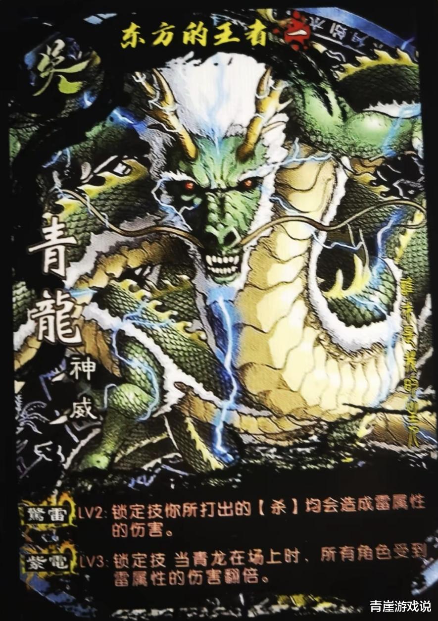 第二位神兽是青龙,称号是东方的王者。【驚雷】是所有杀都变成雷属性伤害,【紫电】是将场上造成的雷属性伤害都+1。青龙虽然有稳定的加伤能力,但它只有杀这张卡牌能增幅,而且没有任何强命与过牌效果,除非场上有张角,不然青龙存在感并不强……