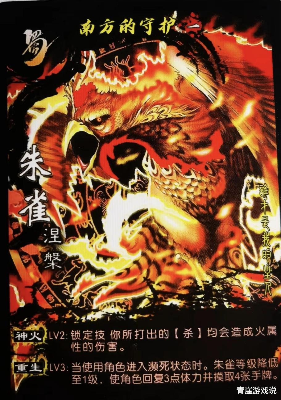 第三位神兽是朱雀,称号是南方的守护。【神火】是所有杀变成火属性伤害,【涅槃】是濒死时,回复三点血量摸四张牌。朱雀完完全全就是一个翻版的标庞统,除了对藤甲有克制关系外,就是一个纯粹的沙包,强度弱到堪比标风时代武将!