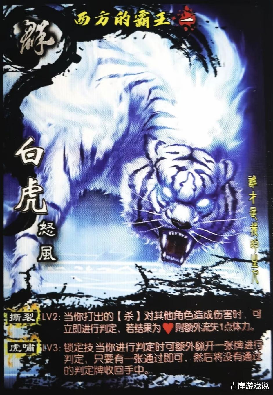 第一位神兽是白虎,称号是西方的霸主。【撕裂】进行判定有概率追加流失体力,【虎啸】能够进行二次判定,而且回收判定没有通过的牌。白虎只要出杀时,就有一半的概率多打一点伤害,如果没有打出追加伤害,则是最少拿到两张牌。作为主杀戮的神兽,白虎神兽强度还算不错。