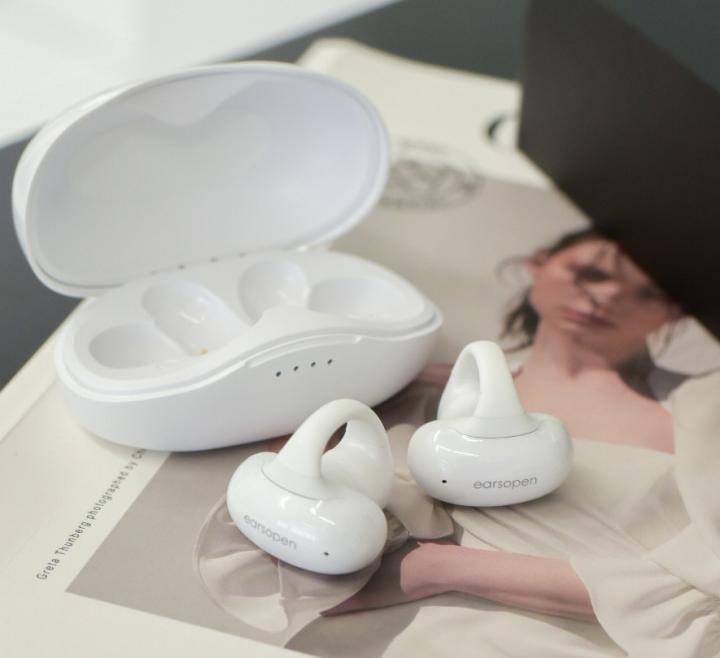 在结构设计上,耳机采用耳夹式方案,主体通过柔性硅胶带连接发声单元与电池仓,边缘采用光滑曲面处理,并辅以磨砂金属材质,能够兼容眼镜、帽子等配件佩戴,避免使用时冲突。