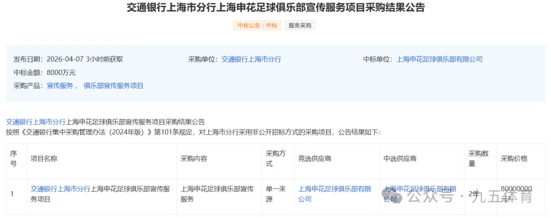 启信宝信息显示,4月7日,“交通银行上海市分行上海申花足球俱乐部宣传服务项目”采购结果公告对外披露。