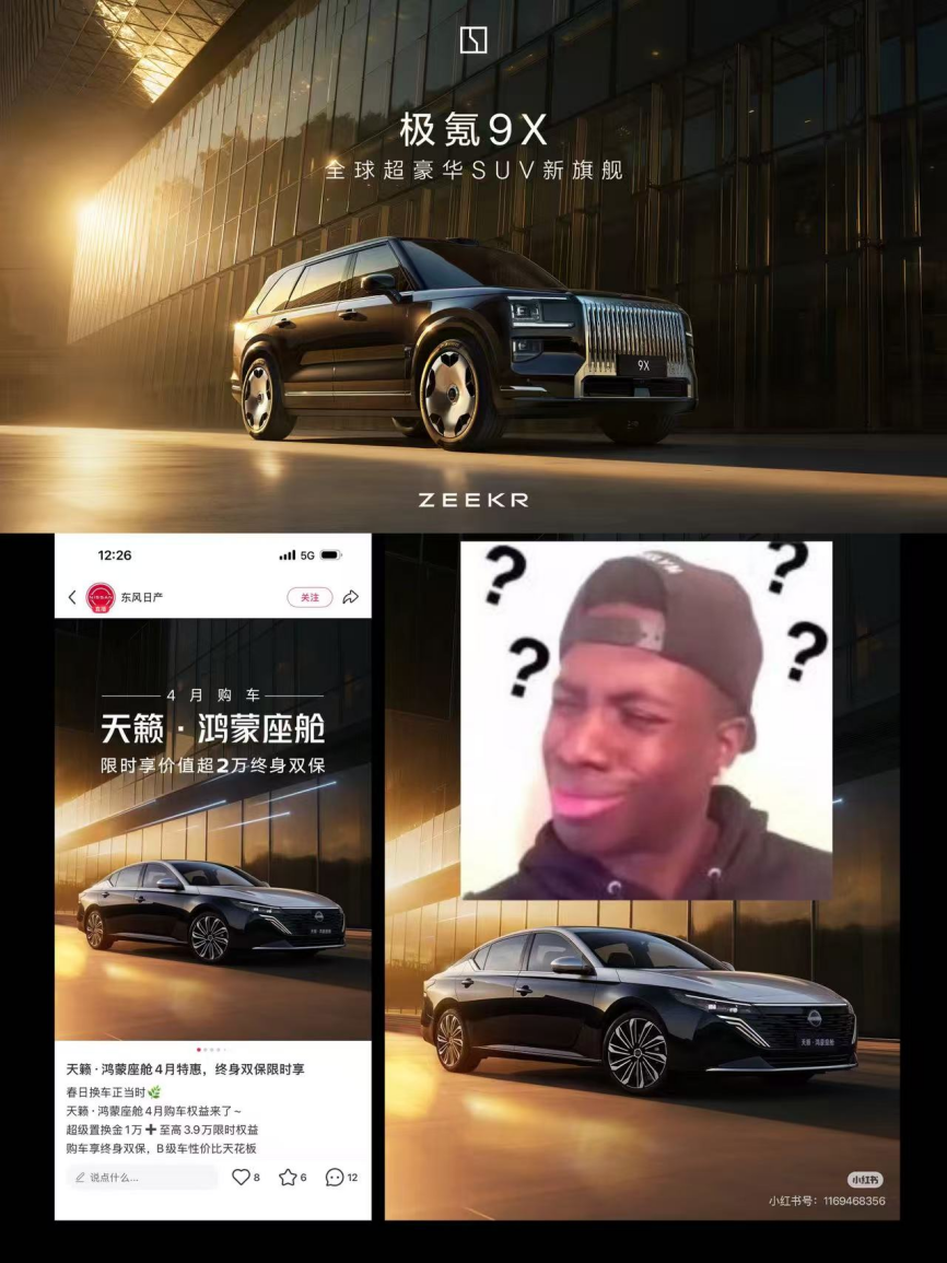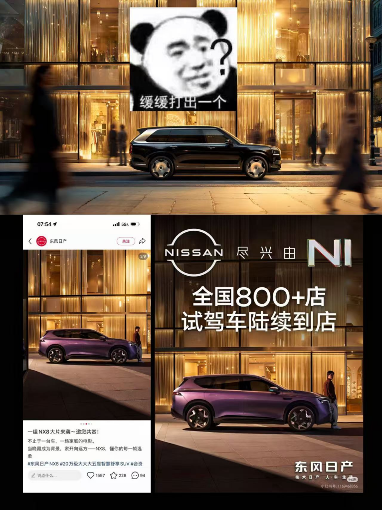 东风日产好歹是合资大厂,一款新车的宣发海报,至于敷衍到抄作业都懒得认真抄吗?极氪9X的原创设计师直接上实锤!另一张海报还