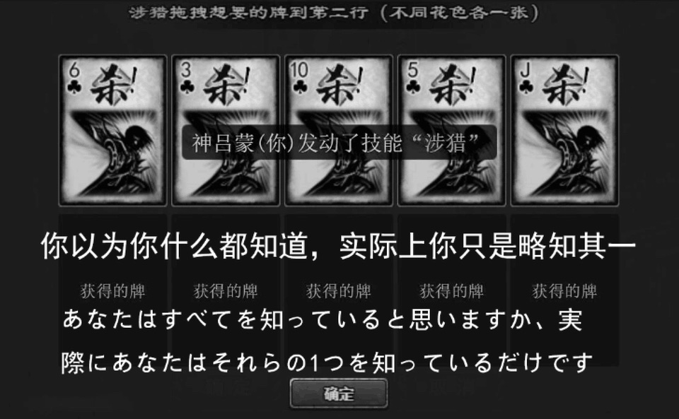 他技能{涉猎}亮出牌顶的五张牌,可以获得其中不同花色的牌。然而问题来了,全是一个花色肿么破?