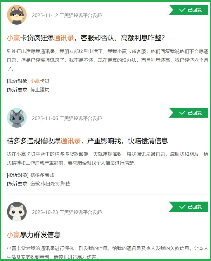 小赢用户在黑猫投诉平台的投诉内容对此也有反映,其中不少消费者的投诉指出,逾期后不仅要应对第三方催收用 “呼死你” 软件发起的骚扰,个人欠款相关信息还会被透传到工作单位,这直接导致他们面临失去工作的风险。