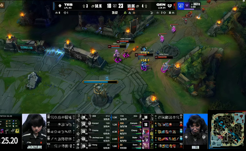 第一局本以为TES下路越塔拿一血能支棱起来,结果Chovy岩雀一个飞天直接砸懵全队,21分钟厄塔汗被抢,24分钟基地就没了。