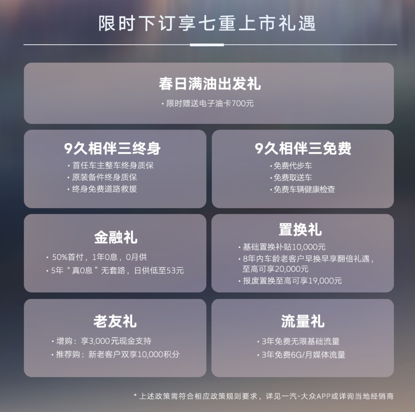 在价格与购车权益上,全新揽巡更是以十足诚意降低用户拥车门槛,让越级品质触手可及。新车推出四驱至尊版与四驱旗舰版两款车型,定价极具竞争力,四驱至尊版24.69万元,四驱旗舰版26.69万元,以低于部分同级车型的价格,带来更丰富的配置和更出色的体验。同时,厂家推出限时七重上市礼遇,全方位覆盖购车、用车、养车全流程:春日满油出发礼限时赠送700元电子油卡,为新车出行注入动力;9久相伴三终身为首任车主提供整车终身质保、原装备件终身质保及终身免费道路救援,彻底消除用车后顾之忧;9久相伴三免费提供免费代步车、免费取送车、免费车辆健康检查,让日常用车更省心;金融礼提供50%首付,可享1年0息、0月供,更有5年真0息无套路方案,日供低至53元,大幅缓解购车资金压力;置换礼基础置换补贴10000元,8年内车龄老客户翻倍礼遇至高可享20000元,报废置换至高可享19000元,老车主换购更划算;老友礼增购享3000元现金支持,推荐购车新老客户双享10000积分;流量礼提供3年免费无限基础流量与3年免费6G/月媒体流量,满足智能座舱的用网需求。