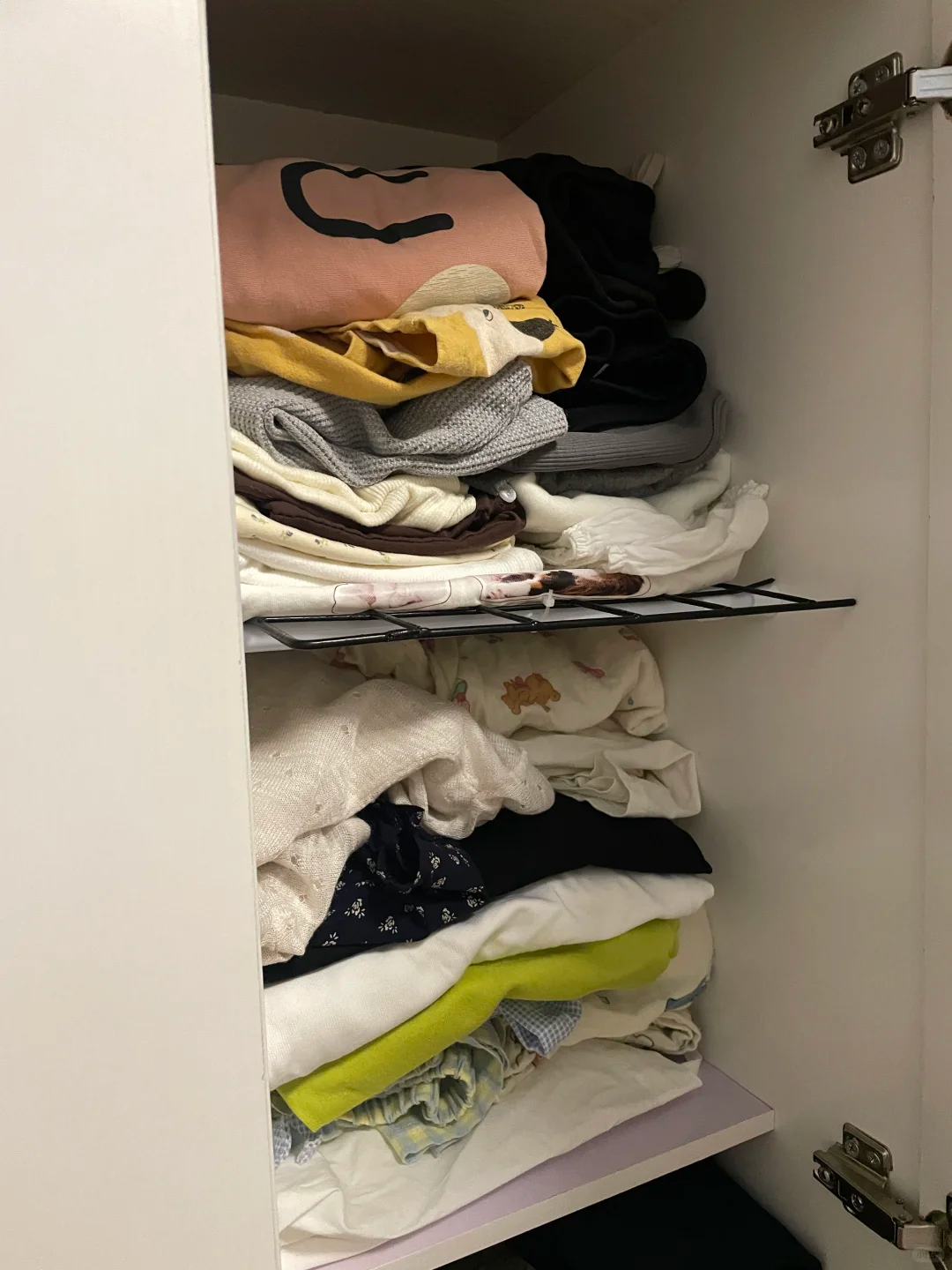 想把衣柜的挂衣区改造成叠衣区,这样收纳的衣服会更多,利用伸缩杆就可以了,把伸缩杆固定在合适的位置上,然后再用一个网格片放在上面。这样叠好的衣服就能分层收纳。