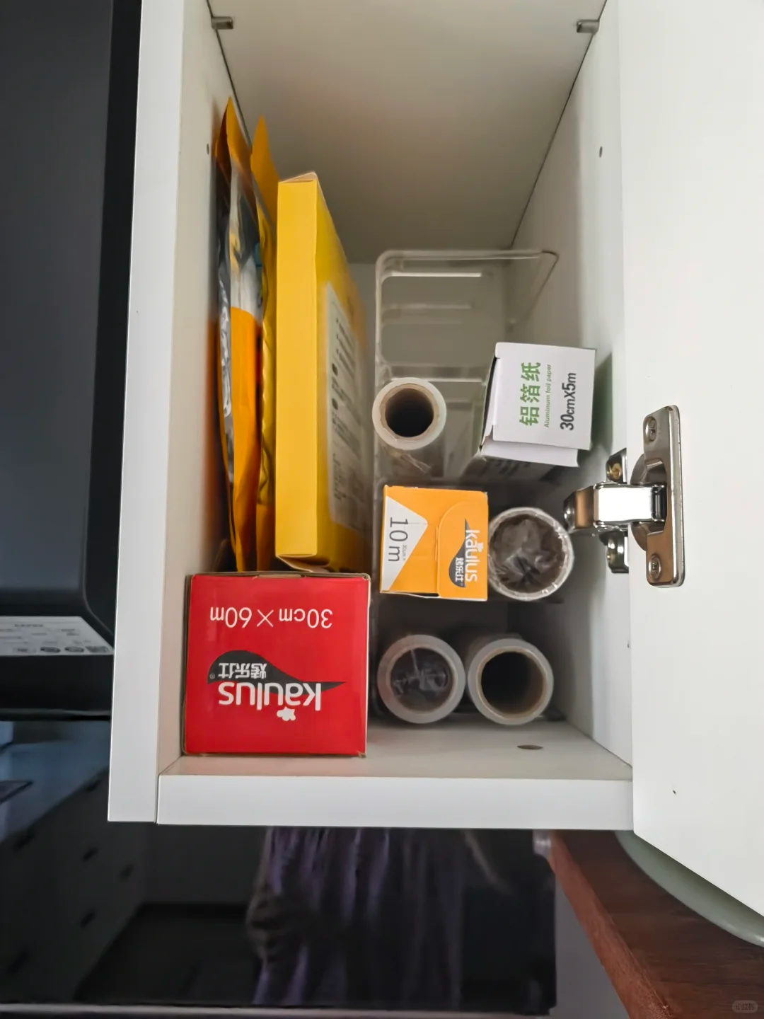 厨房的柜子虽然比较深,比较大,但是放满了东西之后拿取特别不方便。我们可以利用书立将厨房的柜子分隔,