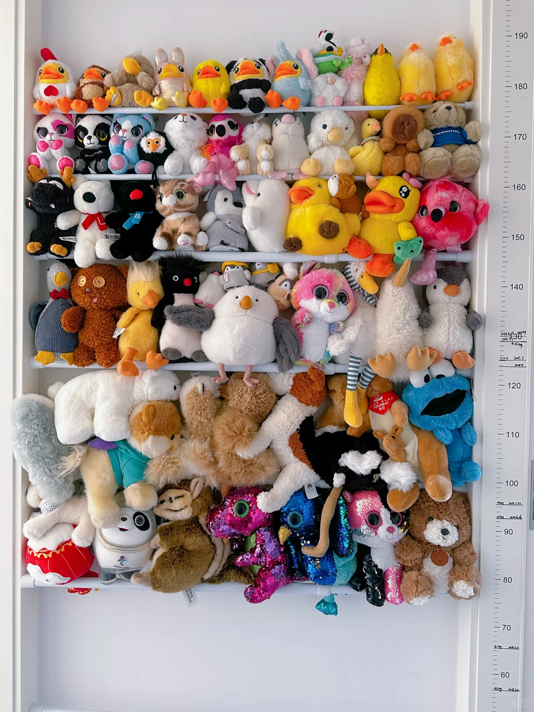 然后这些毛绒玩具就可以挂在上面了像家里的门后或者是走廊过道,只要有空闲的地方可以固定多根伸缩杆,然后把毛绒玩具固定在里面