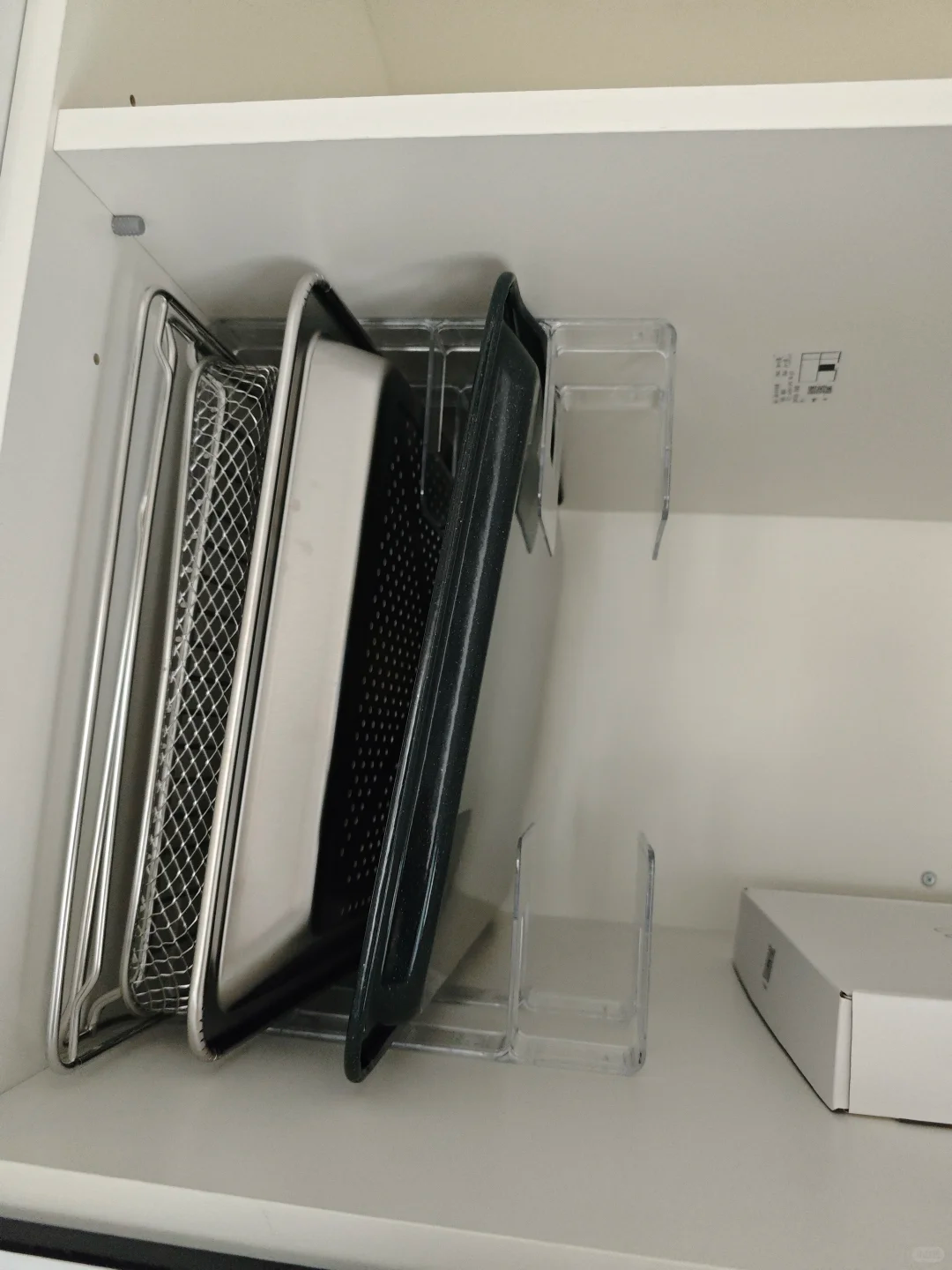 把书立固定在柜子的上下两边,然后这些大一点的烤盘,餐盘,就可以直接放在中间竖起来收纳,用的时候直接抽出来特别省力。
