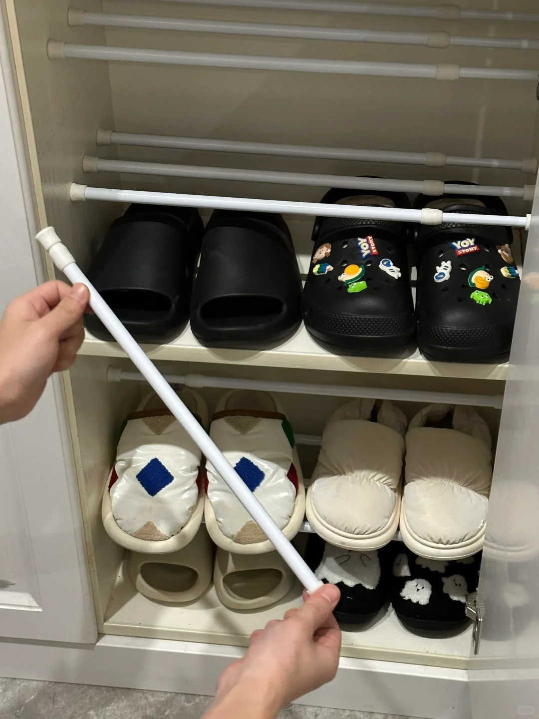 伸缩杆还可以增加鞋柜的收纳空间,鞋柜虽然大,但是放了一层鞋子之后,上面就会有空间浪费,利用伸缩杆将鞋柜分成多层,这样就可以放置多双鞋子了。