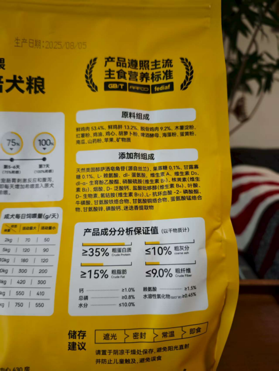 希喂的原料用的很实在,75%的动物性原料里有62%都是鲜鸡肉,含有优质的丰富蛋白、氨基酸和硒元素。营养结构完整,单一鸡肉也容易消化。脂肪来源为鸡油,能提供OMEGA-6和充足的热量。整款狗粮粗蛋白实测值达到39.33%,粗脂肪实测值达到18.4%,属于高蛋白中脂肪的营养配比,不会过度囤积脂肪让狗狗长胖,营养密度很高,特别契合需要长肉的狗狗。1.25:1的钙磷比也很合适,这个比例让钙和磷在小肠中的吸收率最高,让狗狗的骨骼发育正常,促进肌肉合成。