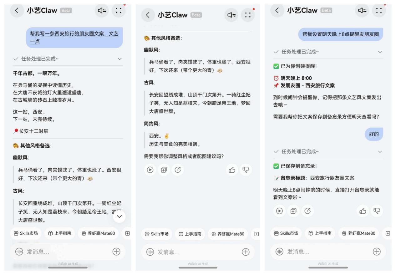 比如当我对小艺Claw说“帮我写一条西安旅行的朋友圈文案,文艺一点”,就会得到多个风格的文案备选,不满意的话还能随时调整风格;得到满意文案后,还可以向小艺Claw说“帮我设置明天晚上8点提醒发朋友圈”,它会和闹钟和日历进行联动创建提醒,同时可以将文案保存到备忘录方便我明天查看,这一点非常贴心!