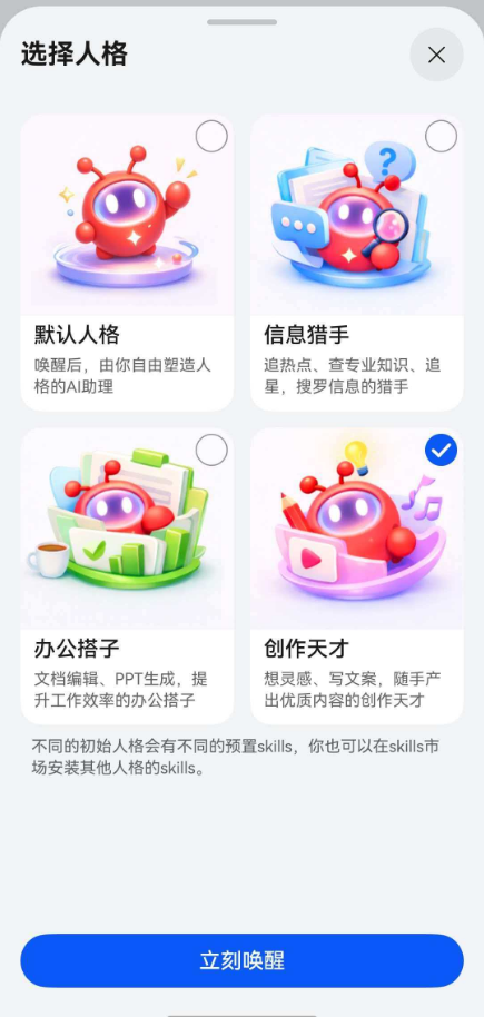 最开始,小艺Claw内置了四种初始人格,能精准覆盖日常的高频场景,大家可以按照自己常用功能来选择,然后可以基于这种人格来打造自己专属的小龙虾,TA会根据你的使用习惯逐步“适配”,越用越好用,越用越顺手!