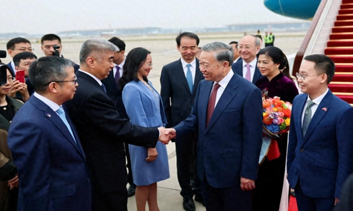 4月14日上午,越共中央总书记、越南国家主席苏林乘坐专机抵达北京,作为他实现党政一把抓后的首次外访。