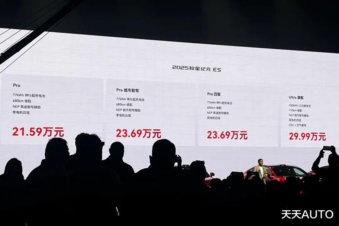 2025星纪元ES Pro:单电机,77kWh电池,680km续航,NEP高速智驾,售价21.59万元;