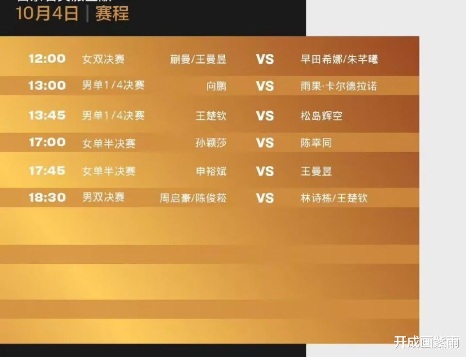 WTT中国大满贯10月4日继续进行,一共6场比赛,包括男双决赛、女双决赛,2场女单半决赛,2场男单1/4决赛。另一方面,随着张本智和一轮游,张本美和也无缘女单半决赛,被王曼昱4-0横扫出局!