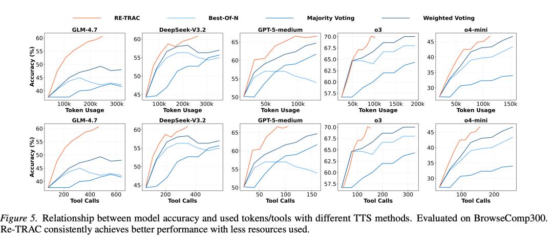 o4-mini 通过 Re-TRAC 从 25.7% 提升到 46.8%; o3 从 54.9% 提升到 69.8%; GPT-5-medium 从 48.3% 提升到 66.6%; DeepSeek-V3.2 从 45.3% 提升到 60.8%; GLM-4.7 从 37.7% 提升到 60.7%。在传统框架中,由于轨迹相互独立,资源使用量通常随扩展近似线性增长。Re-TRAC 会继承之前轮次的状态,使搜索空间逐步收敛,从而减少冗余工具调用与重复探索,提升探索的效率。