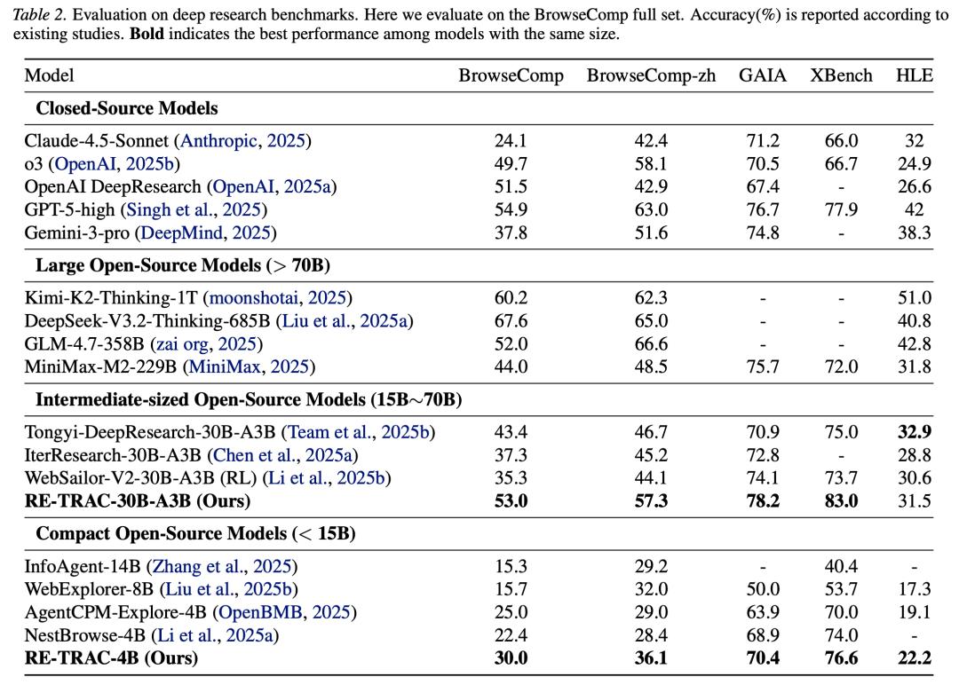 RE-TRAC-30B 同样表现出色,在除 HLE 外的所有基准上都击败了 MiniMAX-M2-229B。