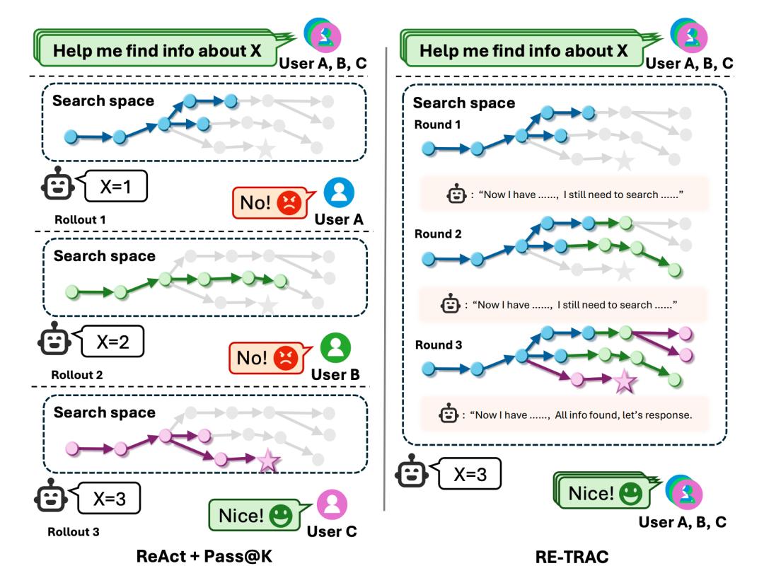 来自东南大学、微软亚洲研究院等机构的研究团队提出了一种全新的解决方案——Re-TRAC(REcursive TRAjectory Compression),这个框架让 AI 智能体能够「记住」每次探索的经验,在多个探索轨迹之间传递经验,实现渐进式的智能搜索。