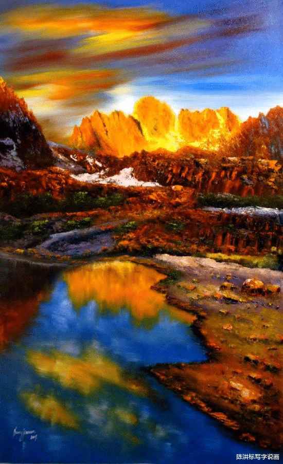 在黄建南的绘画创作中,不仅用对比强烈的油彩描绘大自然的山山水水和秀丽的风景,而且把传统的中国水墨画进行了改良,加入了鲜艳的色彩和质感的肌理,让整个画面富有蓬勃生机和立体效果。他说只有这样才足以表达心中的祖国大好河山。