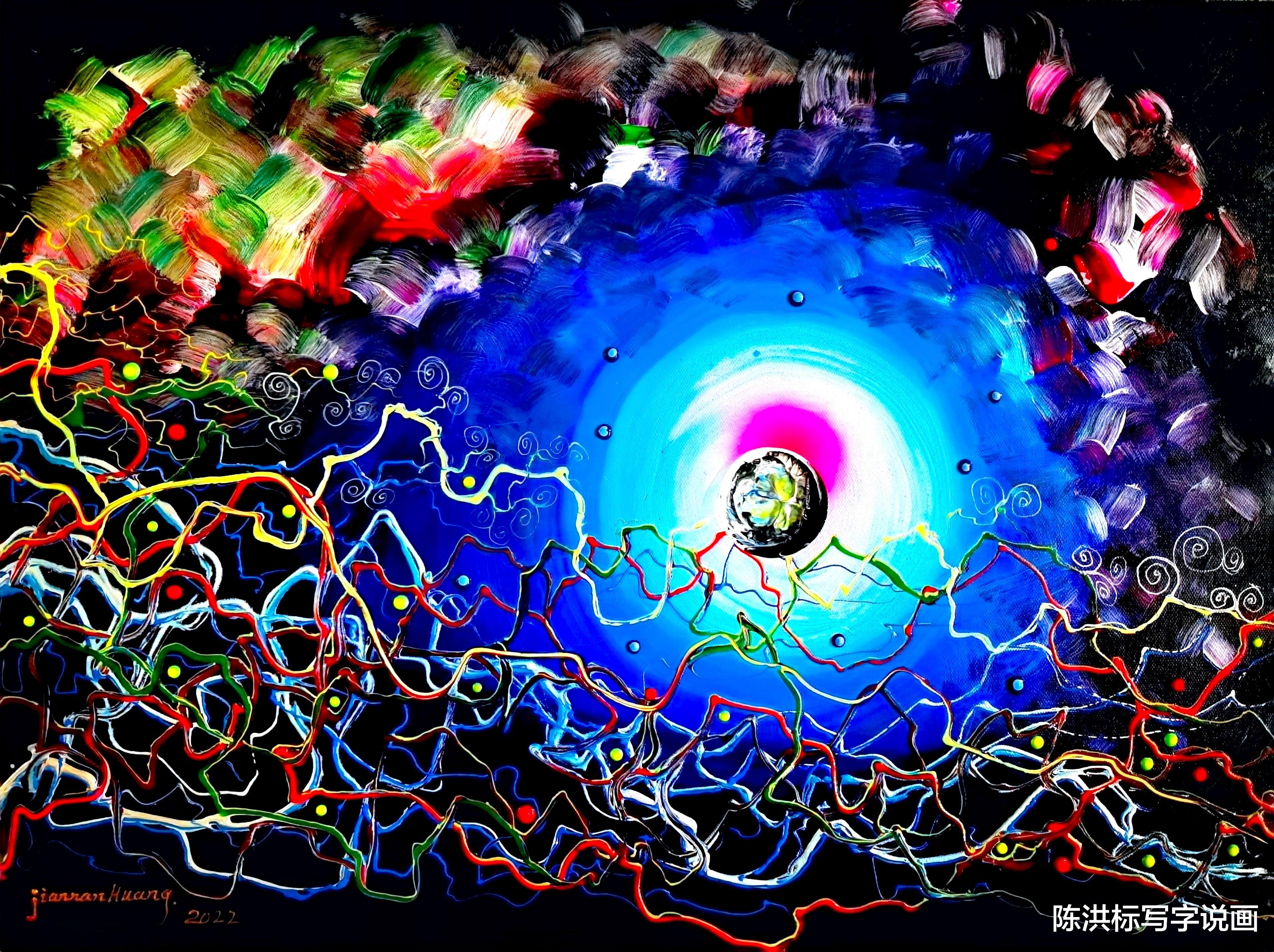 因为黄建南的油画和中国画作品都以中国文化为底色,融入了东方哲学和宇宙的神秘科学,并与西方现代艺术相结合,从而形成了独特的艺术风格。