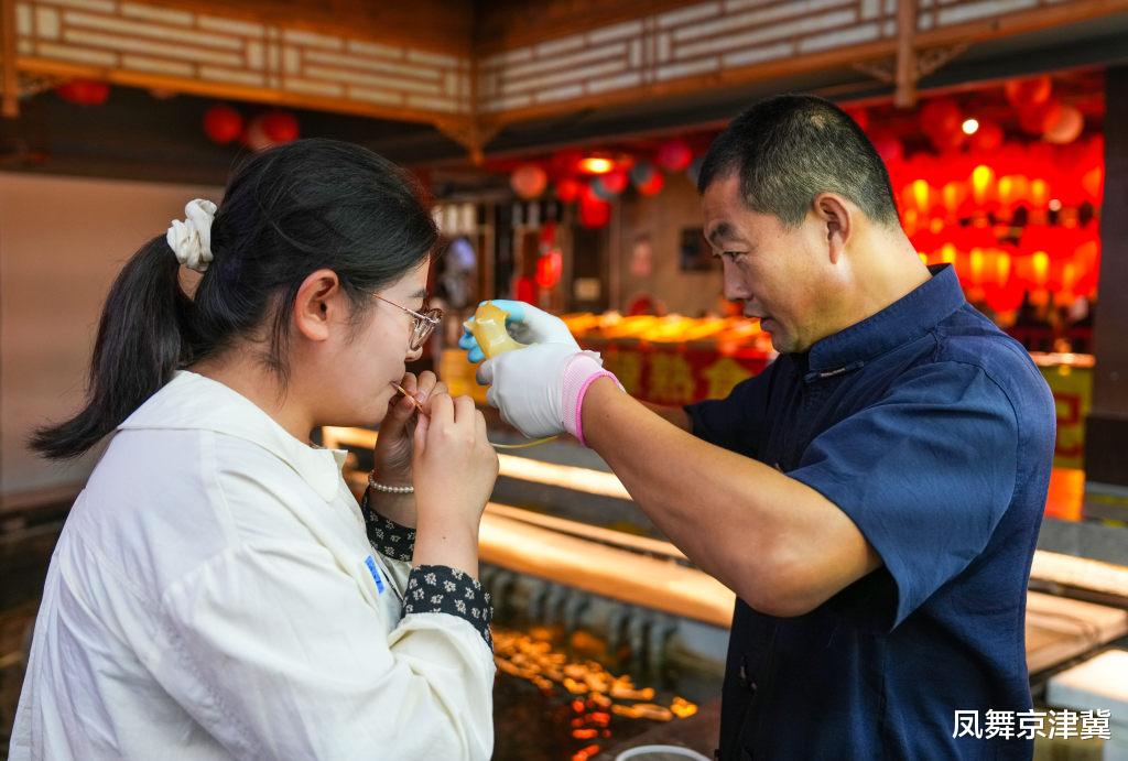 10月5日,游客在保定宴饮食博物馆体验吹糖人技艺。