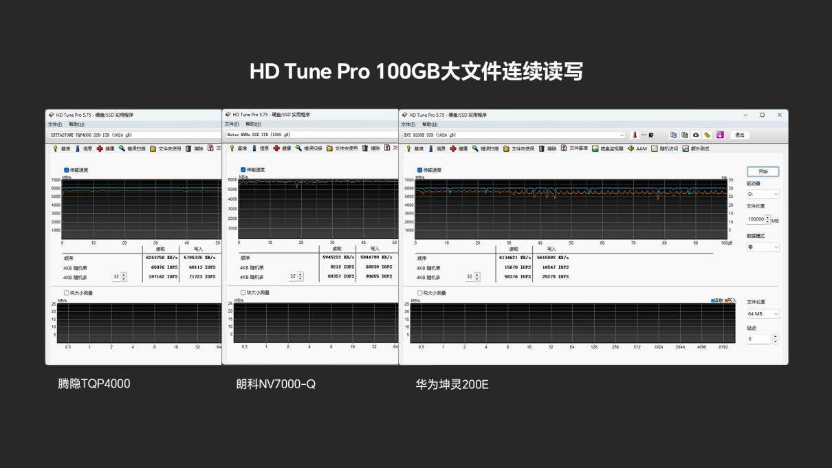 超大体积的文件读写也是考验SSD性能的关键,这三款硬盘都采用无缓方案,再结合散热上的差异,长时间高负载不掉速就是关键。通过HD Tune Pro测试100GB大文件读写,腾隐TQP4000的读写速度和稳定性表现都最好,朗科NV7000-Q速度稍慢但比较稳定,华为坤灵200E起伏较大。