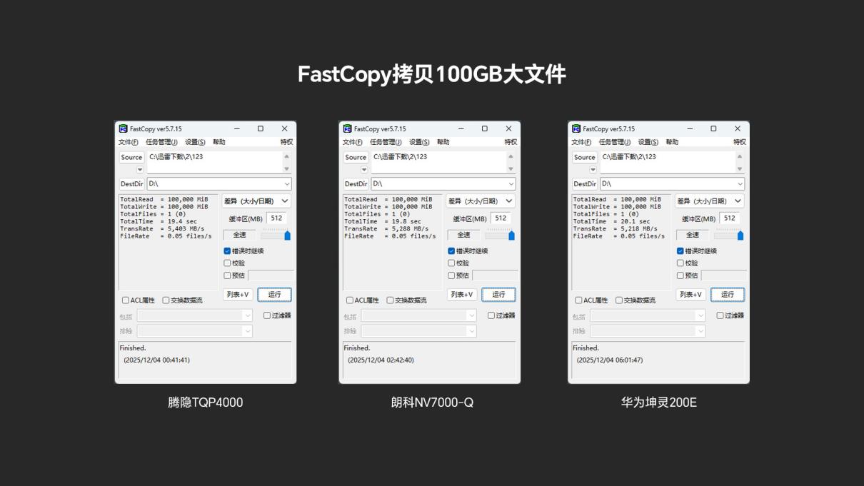 如果你觉得看这些数字不够直观,接下来就通过拷贝测试,告诉你拷贝多大的文件耗时多久。通过FastCopy工具就能代替手动操作并统计时长,但它是实打实的拷贝文件,并非理论数值计算。分别拷贝100G文件到三款SSD中,腾隐和朗科用时均为19秒,华为用时20秒,表现都很优秀。