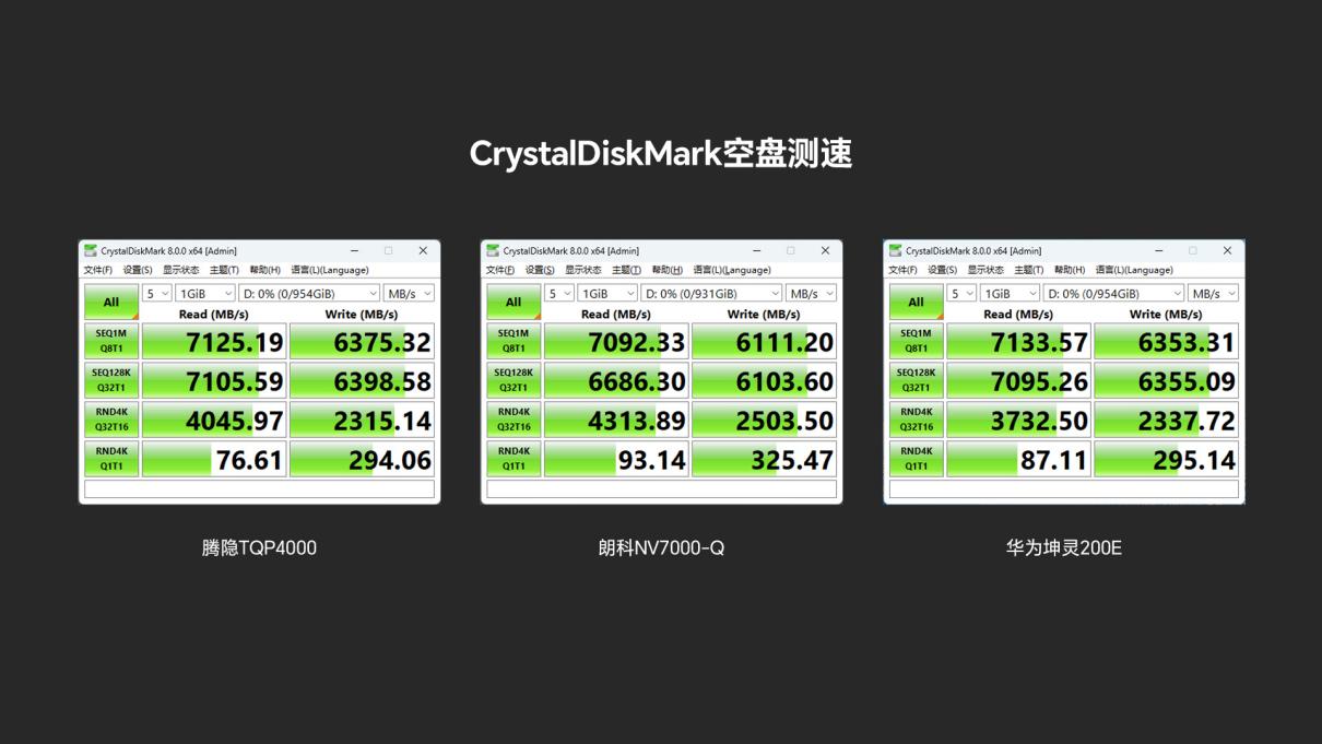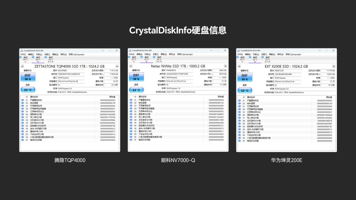 首先利用CrystalDiskInfo工具读取三款硬盘的信息。主要区别就是腾隐TQP4000和华为坤灵200E都是NVMe 2.0标准,朗科NV7000-Q是NVMe 1.4标准,NVMe 2.0显然在性能上更有优势,但也要看后面具体的测速表现。