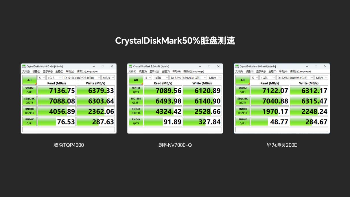 所谓“脏盘”就是指硬盘使用后有了一定的容量占用,看读写速度还能否和空盘时一样优秀。这里以半盘50%和接近满盘90%来测试,三款SSD的读写速度和空盘状态几乎没差。