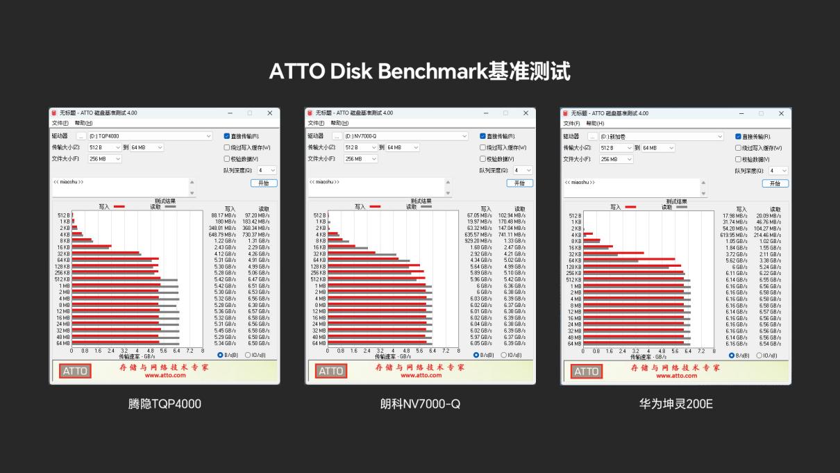 在实际使用中,我们一次读取或写入的文件体积不等,SSD对于不同大小文件的读写性能也是不同的。通过ATTO Disk Benchmark进行磁盘基准测试,就能观察到不同大小文件的读写速度变化。从测试结果可以看到,三款SSD都在读写64K以上文件的时候速度更快,相比之下腾隐TQP4000的峰值速度稍有优势。