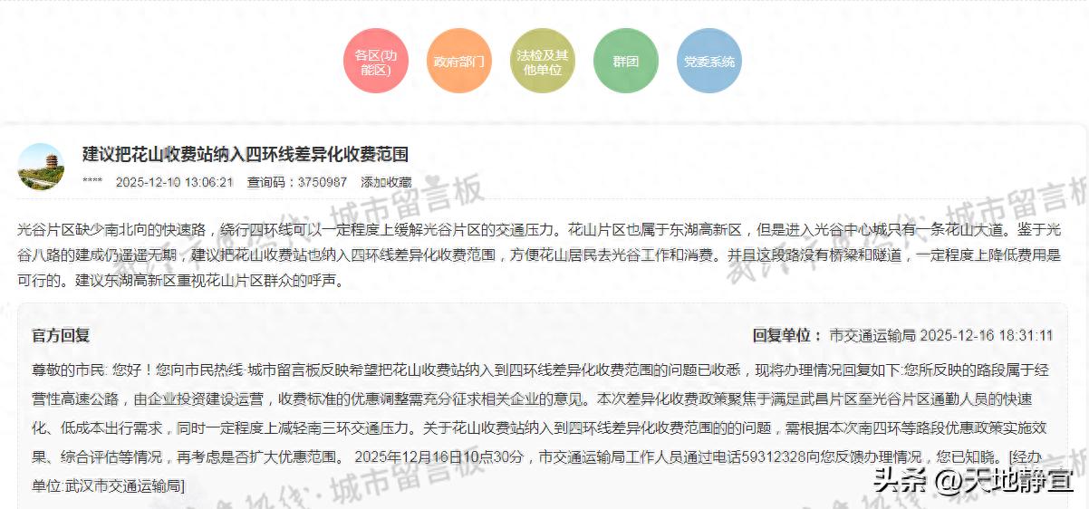 官方回复:您所反映的路段属于经营性高速公路,由企业投资建设运营,收费标准的优惠调整需充分征求相关企业的意见。本次差异化收费政策聚焦于满足武昌片区至光谷片区通勤人员的快速化、低成本出行需求,同时一定程度上减轻南三环交通压力。关于花山收费站纳入到四环线差异化收费范围的的问题,需根据本次南四环等路段优惠政策实施效果、综合评估等情况,再考虑是否扩大优惠范围。