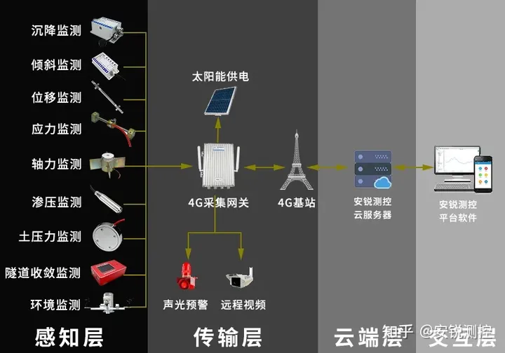感知层主要是通过在隧道内布设测沉降、倾斜、位移、受力、周边环境等类型的传感器,实现对影响隧道结构安全和健康的关键数据进行实时测量。