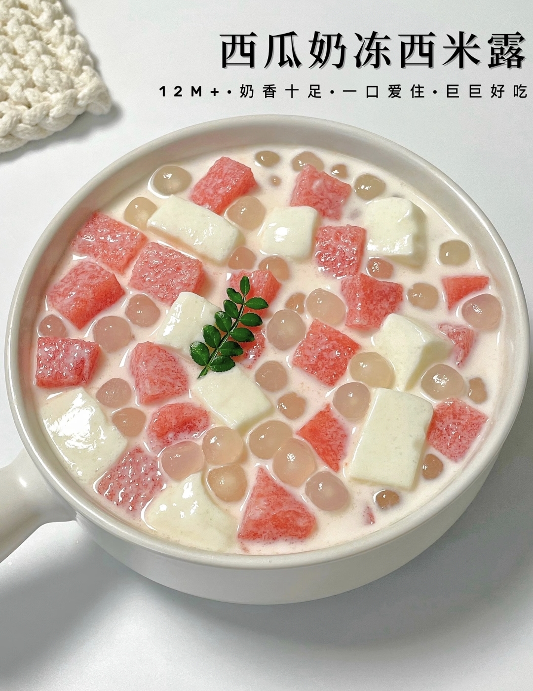 其实这碗甜水是“意外产物”——上周家里剩了半块西瓜,冰箱里还有没喝完的牛奶,本来想随便煮个西米露,结果翻出了之前做果冻剩下的白凉粉,干脆加进去凑了个“奶冻版”。