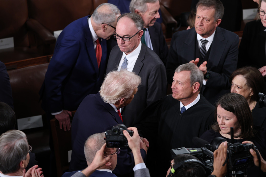 特朗普和最高法院首席大法官罗伯茨握手,前几天最高法院刚宣布特朗普的关税政策违法