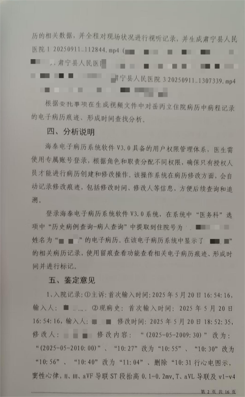 为核实病历真实性,2025年9月11日,肃宁县法院委托天津市一物证司法鉴定单位,对岳某立诊疗电子病历的记录痕迹、形成时间进行司法鉴定。该鉴定所依据相关行业标准开展鉴定工作,于9月12日出具的鉴定意见显示,岳某立的入院记录、病程记录、手术资料、出院总结等多项电子病历内容存在修改、删除、时间调整等操作痕迹,涉及诊疗时间、检查数值、既往病史、用药及治疗措施等关键信息,司法鉴定确认了院方修改病历的事实。