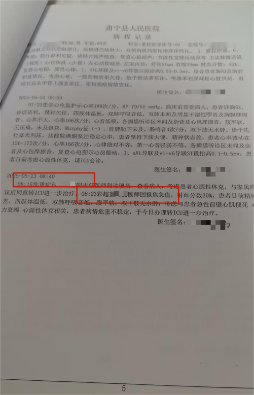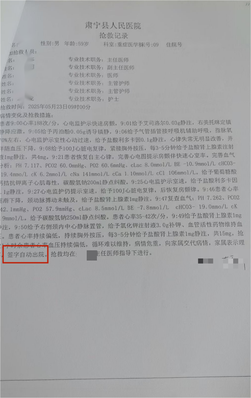 5月23日早晨7时左右,岳某立出现心跳过快等危急情况,家属表示,院方并未立即将患者送进ICU抢救,病历记载8时23分彩超室医生回报危急值,但实际家属彼时仍在心内科,与病历记录严重不符,直至近9时患者才被推入ICU,而心内科与ICU并不在同一栋建筑,距离较远。最终岳某立经抢救无效离世,家属表示患者实际在医院内死亡,但其病历却被标注为家属签字出院,后续家属调取病历时,发现整本病历存在多处修改痕迹,这让家属对院方的诊疗行为产生强烈质疑。