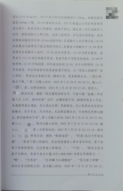 据患者家属介绍,岳某立为农民,平日以种地和打零工为生,2025年5月20日因胸闷前往肃宁县医院急诊,被诊断为急性心肌梗死。家属称,当时曾提出转院想法,院方表示有外院专家在场,建议行心脏造影检查,随后患者被推入介入科。家属方表示,期间院方拿出大量单据要求逐一签字,既未明确说明具体手术内容,也未告知相关风险后果,仅含糊告知是“通开血管”,让家属认为病情可控,且全程未提及溶栓治疗相关信息。相关反映问题,仍待地方部门对接核实。术后院方将患者转入高血压病房,告知家属患者恢复良好,称一个月后视情况再决定是否放置支架,这也让家属放松了警惕。
