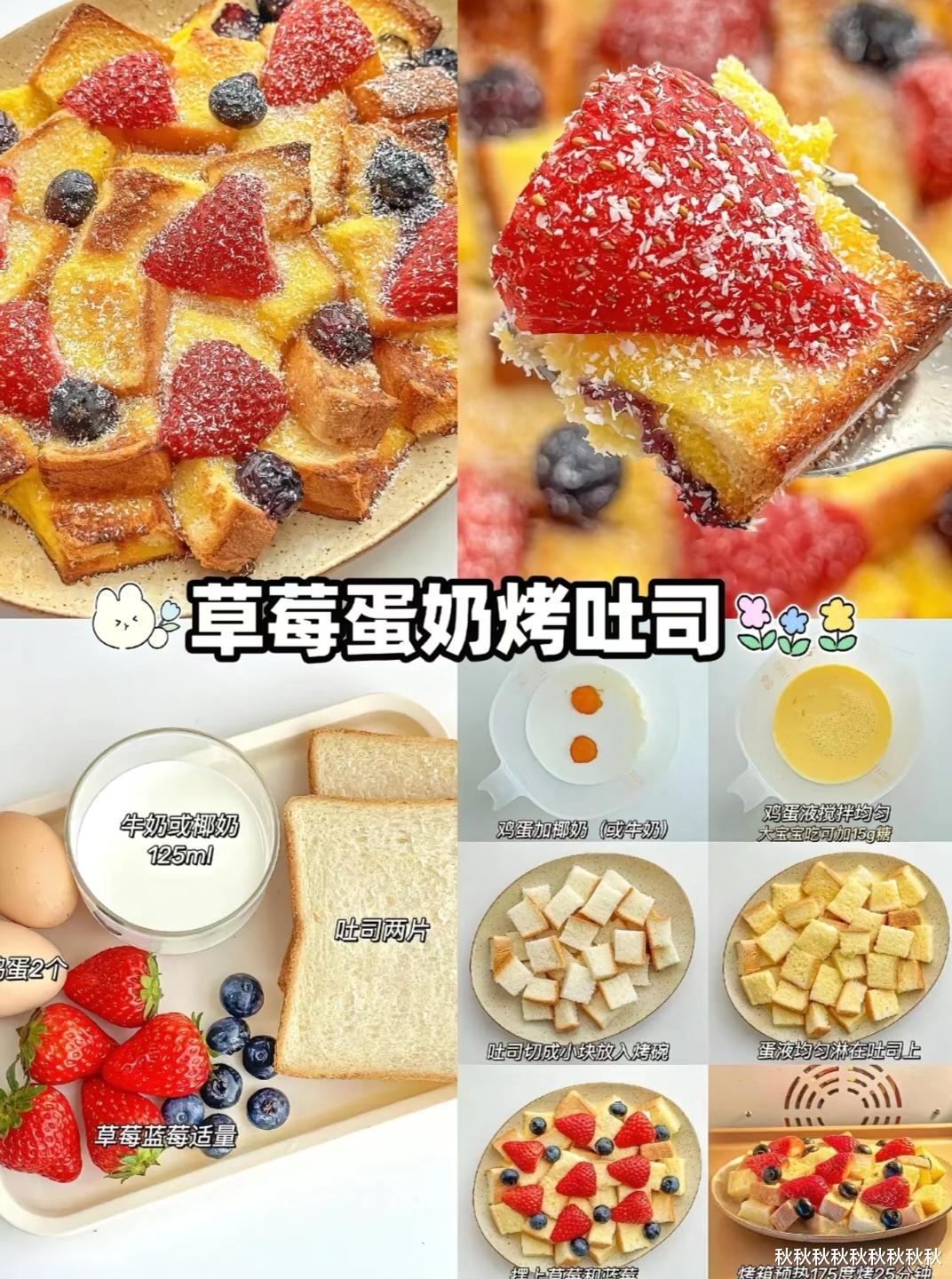 第五步:取出烤好的吐司块,撒上切好的草莓和蓝莓。