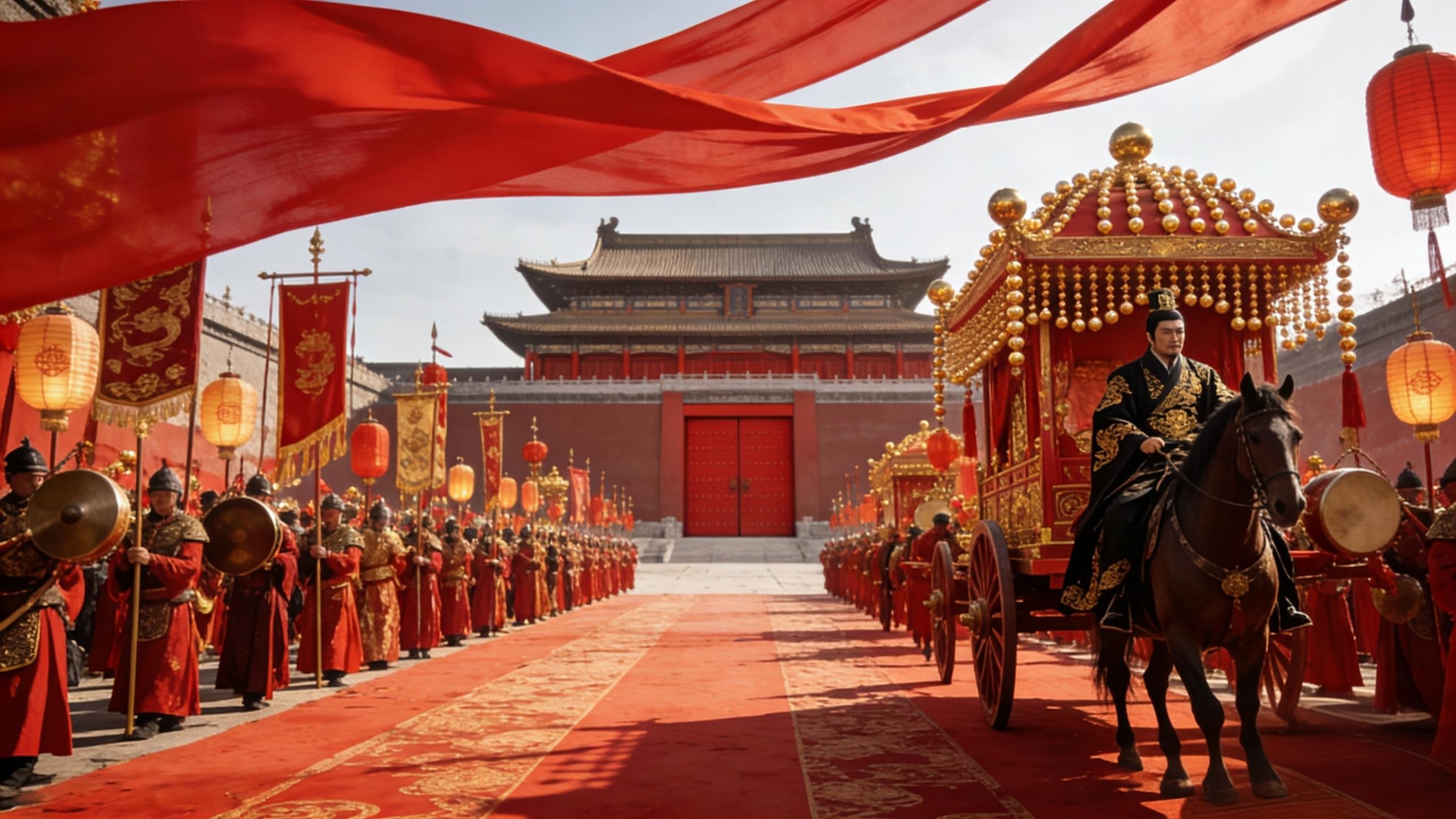 京城的大街小巷,张灯结彩,喜气洋洋。靖王的迎亲队伍,从靖王府出发,一路敲锣打鼓,浩浩荡荡,来到尚书府。