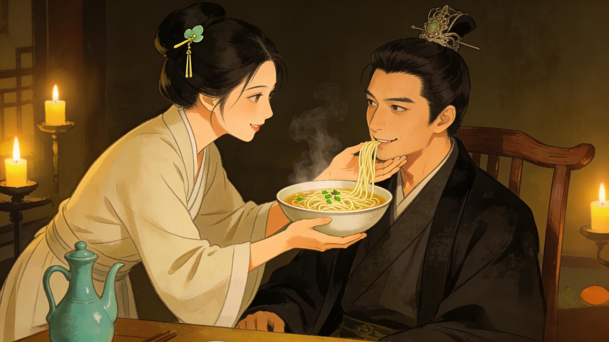 她端着长寿面,缓步走到床边,脸上带着初见时那般楚楚可怜的温柔,眼中却没有半分温度。