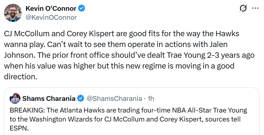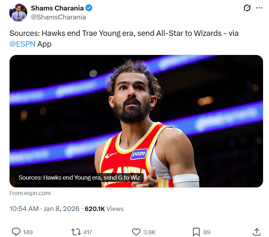 更重要的是名记Shams在后续报道中指出,老鹰队之所以愿意低价卖掉特雷杨,主要也是为了增加财务灵活性,以便在未来一个月追求高薪球员。